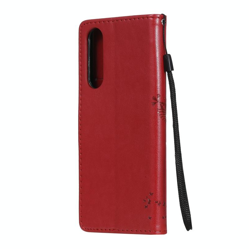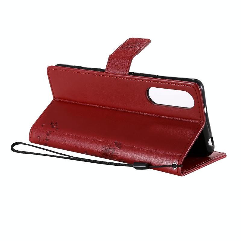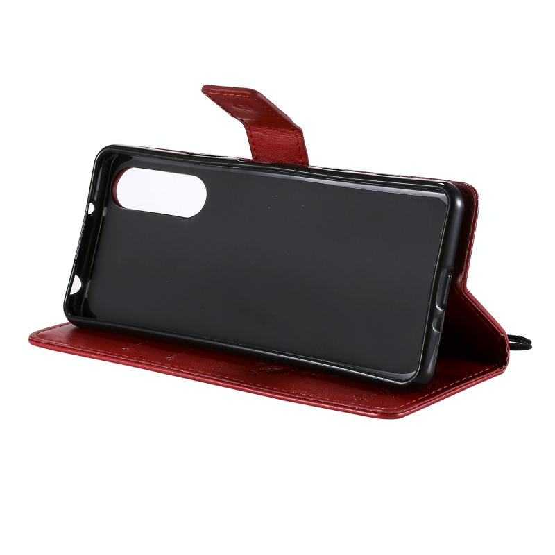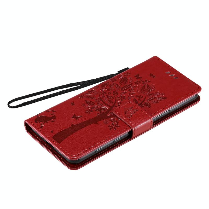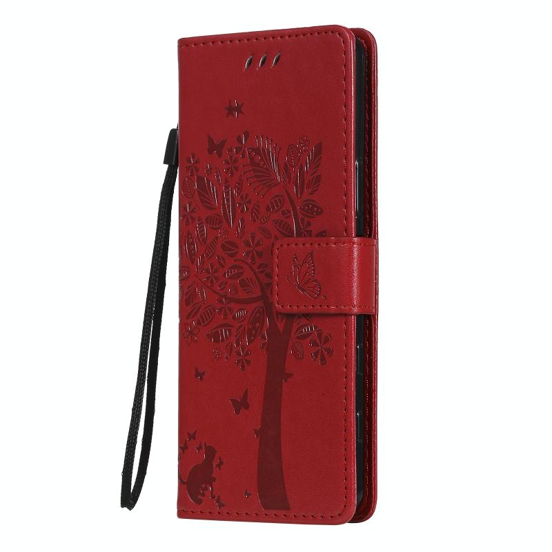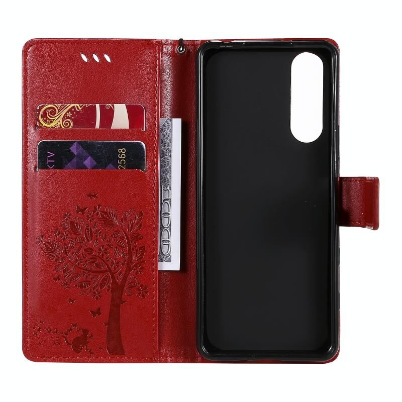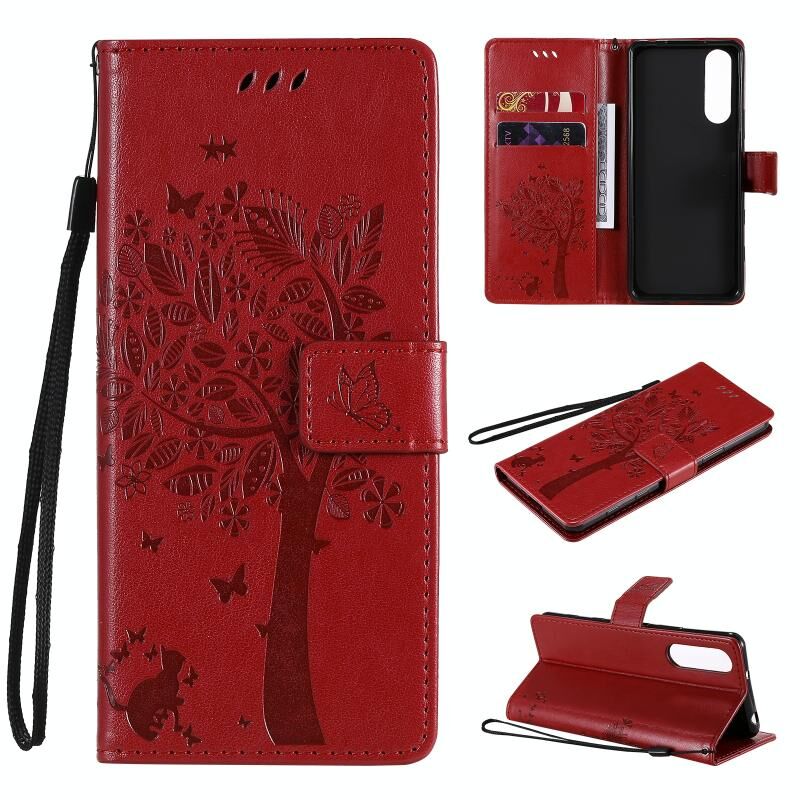 For Sony Xperia5 II Tree & Cat Pattern Pressed Printing Horizontal Flip PU Leather Case with Holder & Card Slots & Wallet & Lanyard(Red)