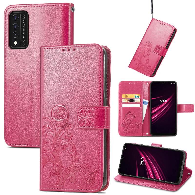 Για T-Mobile REVVL V + 5G τετράφυλλο κούμπωμα ανάγλυφη αγκράφα Κινητό τηλέφωνο Προστασία Δερμάτινη θήκη με κορδόνι & υποδοχή κάρτας & πορτοφόλι & λειτουργία βραχίονα (Magenta)