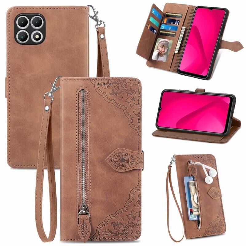 Για T-Mobile T Phone 2 5G ανάγλυφο λουλούδι φερμουάρ δερμάτινη θήκη τηλεφώνου (καφέ)