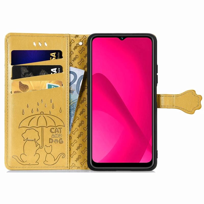 Θήκη τηλεφώνου από δέρμα με ανάγλυφο σχέδιο γάτας και σκύλου για T-Mobile T Phone 2 Pro 5G (Κίτρινο)