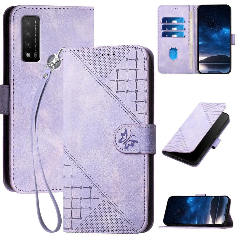 For TCL 20 R 5G Grid Butterfly Embossed Pattern Flip Leather Phone Case with Lanyard(Light Purple)