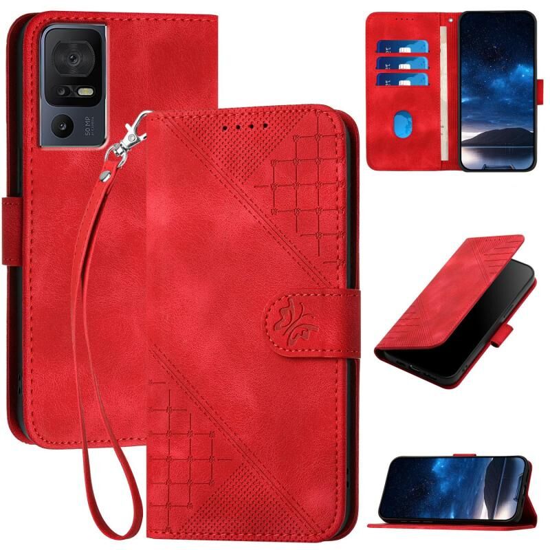 For TCL 40 SE Grid Butterfly Embossed Pattern Flip Leather Phone Case with Lanyard(Red)
