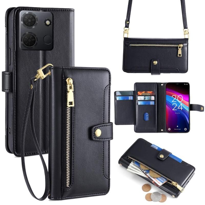 Θήκη τηλεφώνου δερμάτινη με υφή προβάτου, διαγώνια, με φερμουάρ για TCL 503 4G (Μαύρο)