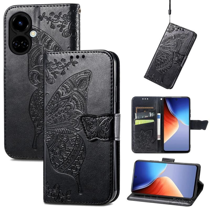 Θήκη τηλεφώνου από δέρμα με ανάγλυφο σχέδιο πεταλούδας και λουλουδιών για Tecno Camon 19 (Μαύρο)