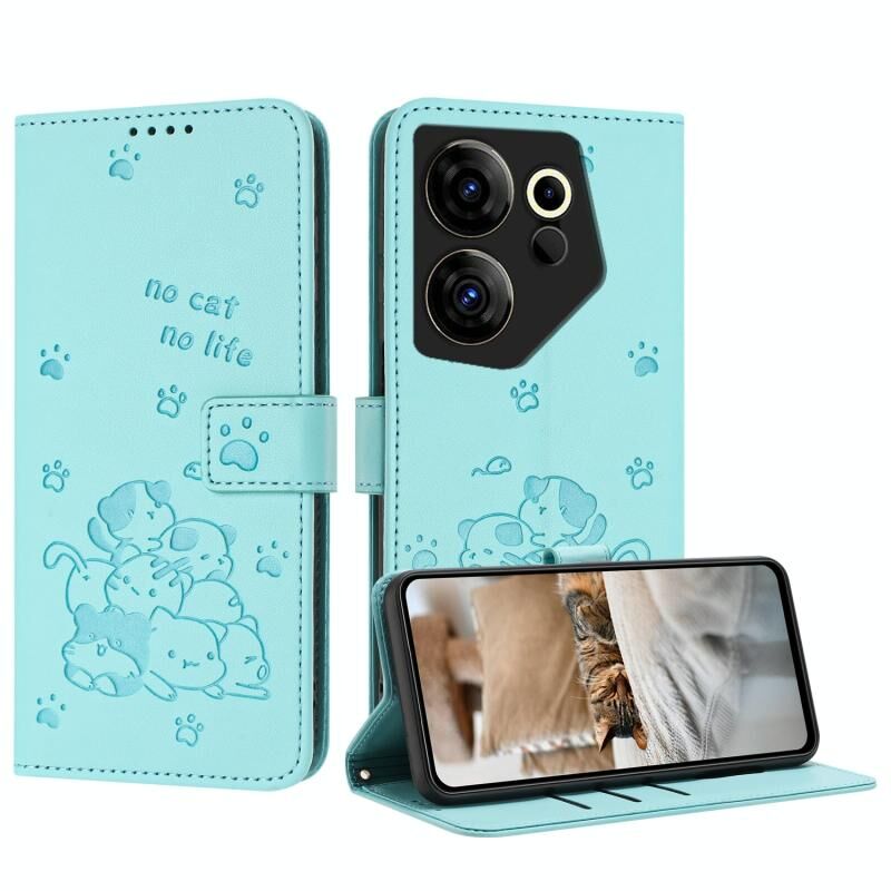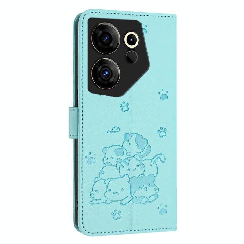 Θήκη δερμάτινη για Tecno Camon 20 Premier με ανάγλυφο σχέδιο γατάκι και λουρί (Μωβ)