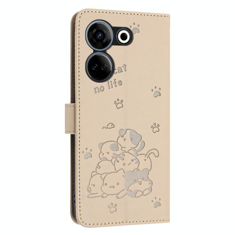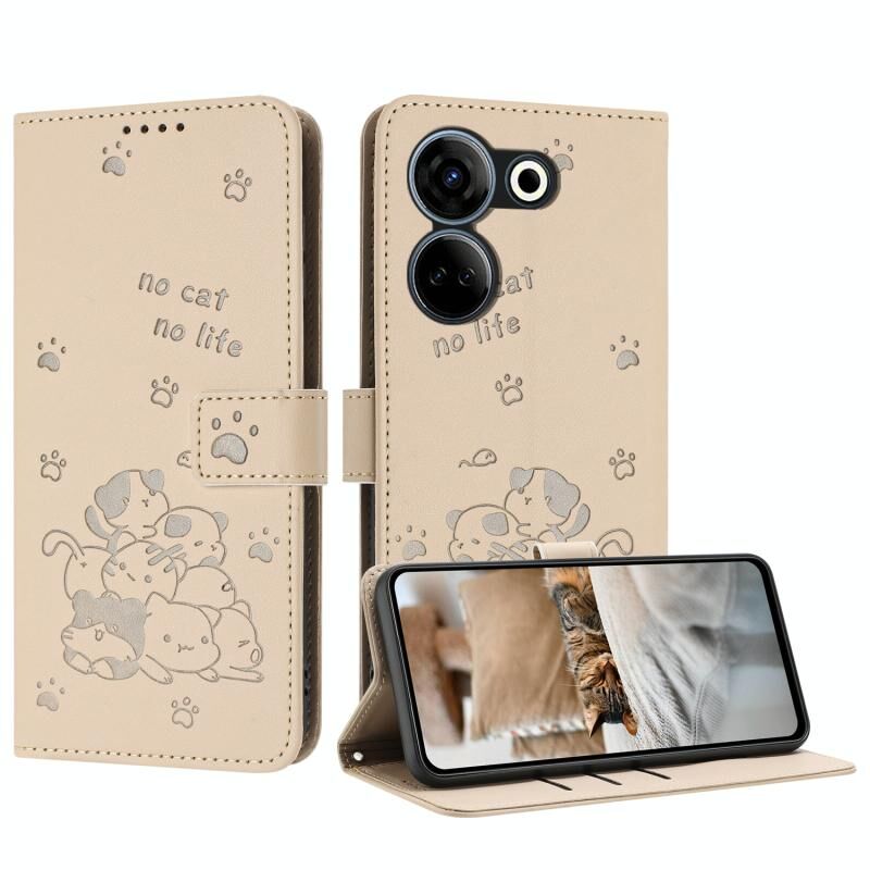 Θήκη δερμάτινη για Tecno Camon 20 Pro 4G / Camon 20 με ανάγλυφο σχέδιο γατάκι και λουρί (Μπεζ)