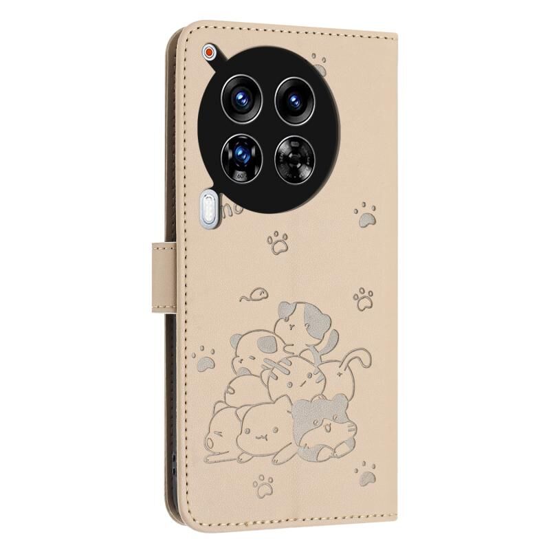Θήκη δερμάτινη για Tecno Camon 30 Premier με ανάγλυφο σχέδιο γατάκι και κορδόνι (Μπεζ)