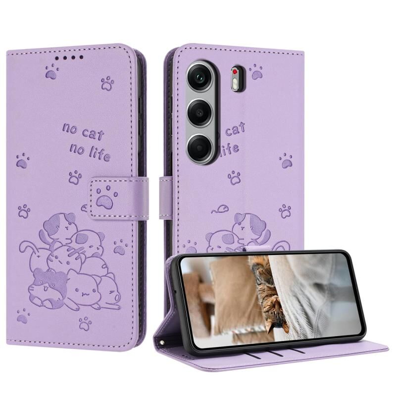 Θήκη δερμάτινη για Tecno Camon 40 4G με ανάγλυφο σχέδιο γατάκι και κορδόνι (Μωβ)
