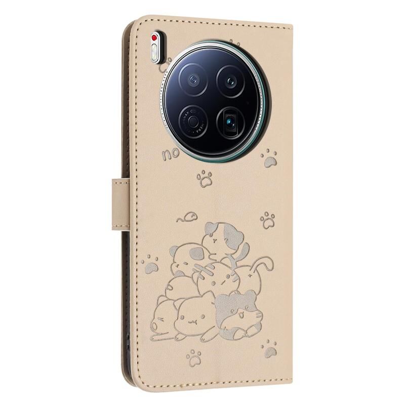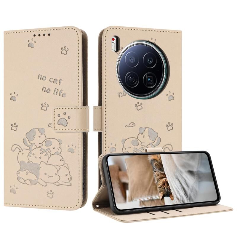 For Tecno Camon 40 Premier Embossed Kitten Phone Leather Case with Lanyard(Beige)