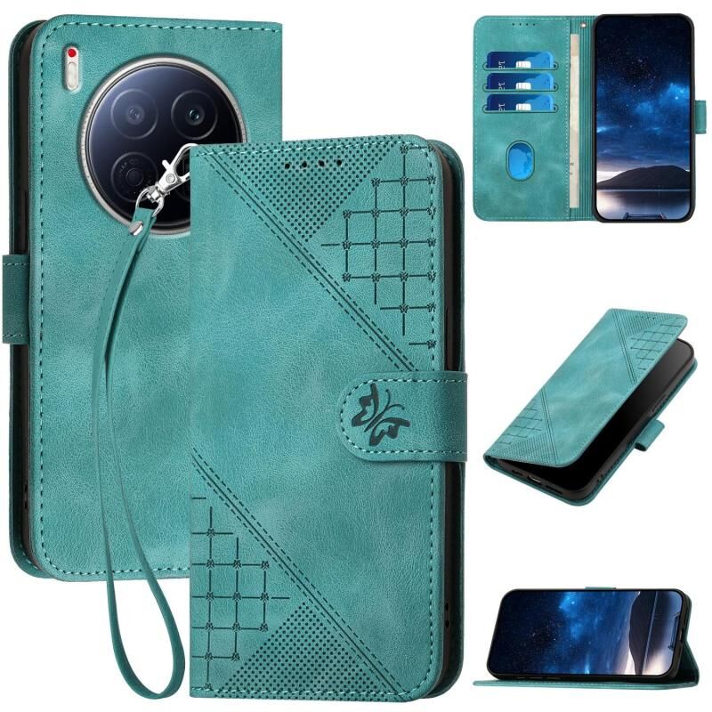 For Tecno Camon 40 Premier Grid Butterfly Embossed Pattern Leather Phone Case with Lanyard(Light Blue)