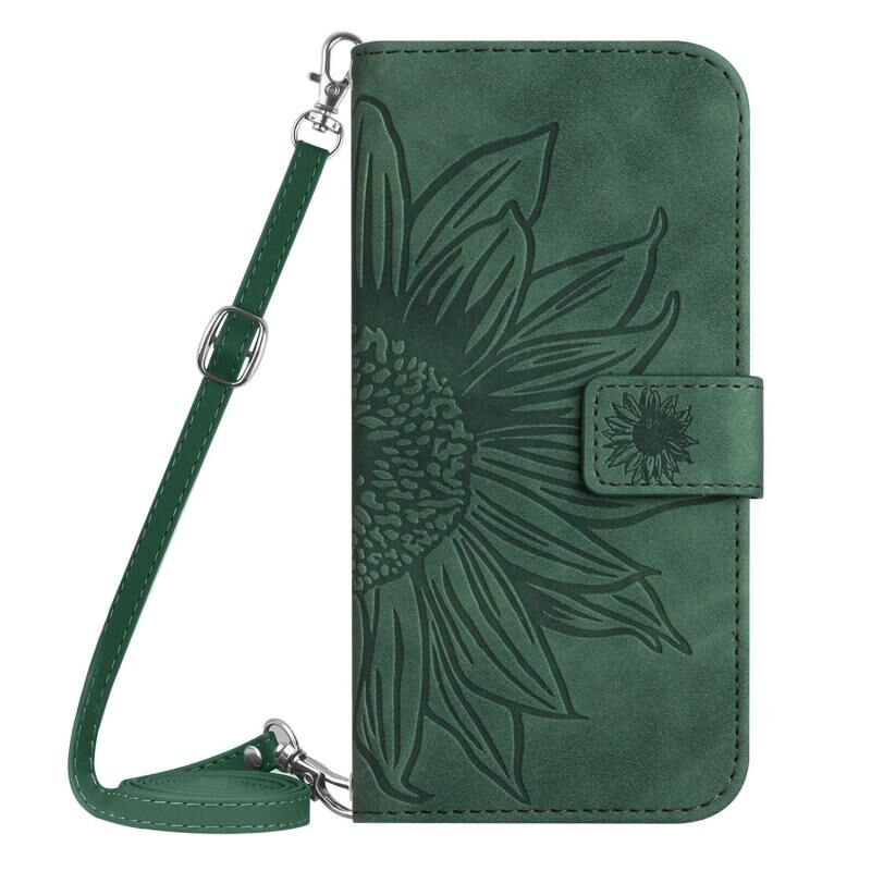 Θήκη τηλεφώνου Tecno Camon 40 Pro 4G με δερμάτινη υφή, ανάγλυφο σχέδιο ηλίανθου και λουρί (πράσινο)