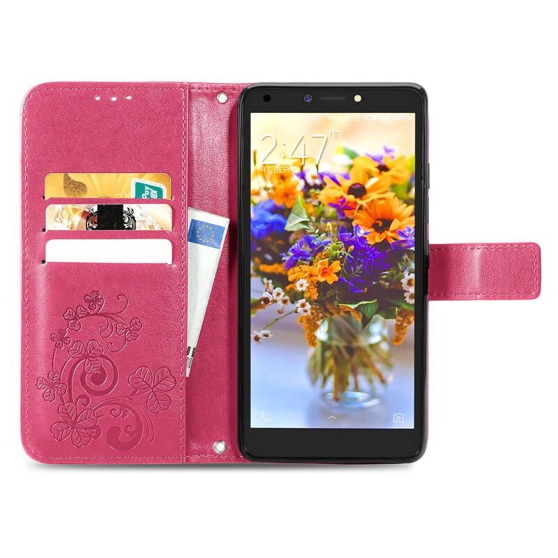 Θήκη δερμάτινη προστασίας κινητού τηλεφώνου για Tecno POP 2F με κουμπωτό κούμπωμα σε σχήμα τριφυλλιού, ανάγλυφο, με κορδόνι, θήκη για κάρτες, πορτοφόλι και λειτουργία βάσης (Ματζέντα)