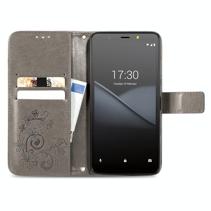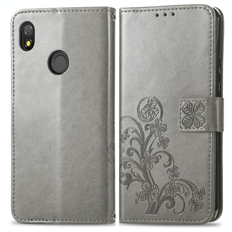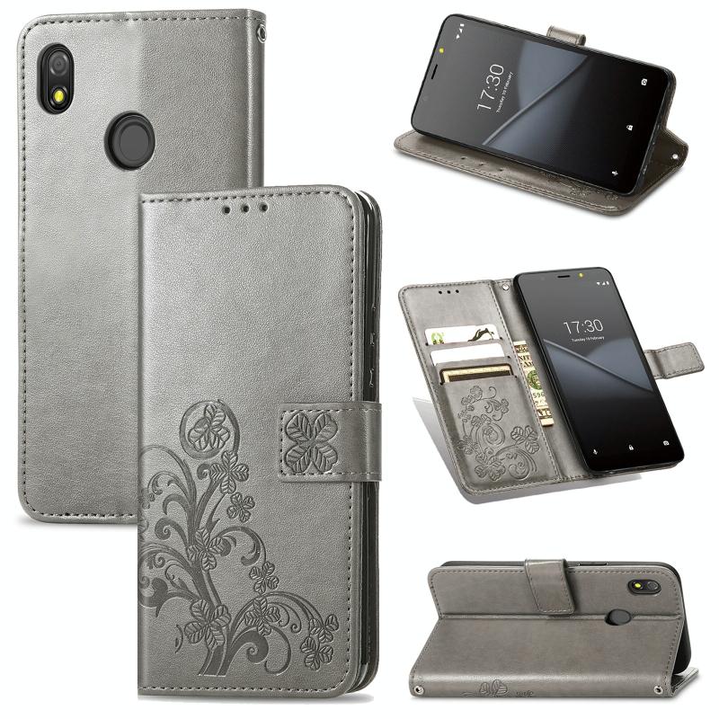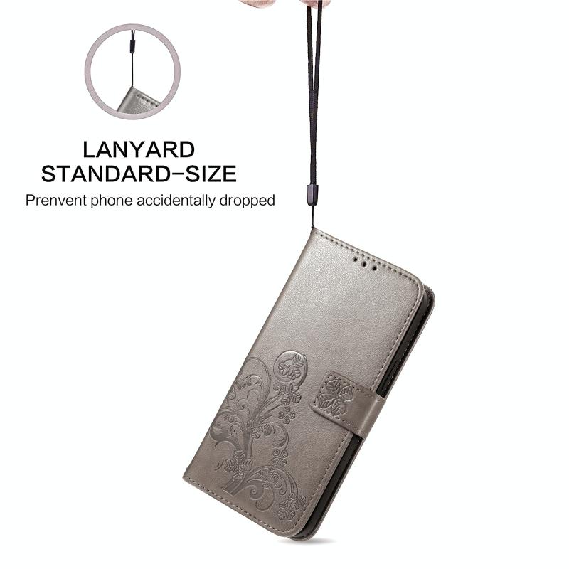 For Tecno Pop 3 Four-leaf Clasp Embossed Buckle Mobile Phone Protection Leather Case with Lanyard & Card Slot & Wallet & Bracket Function(Gray)