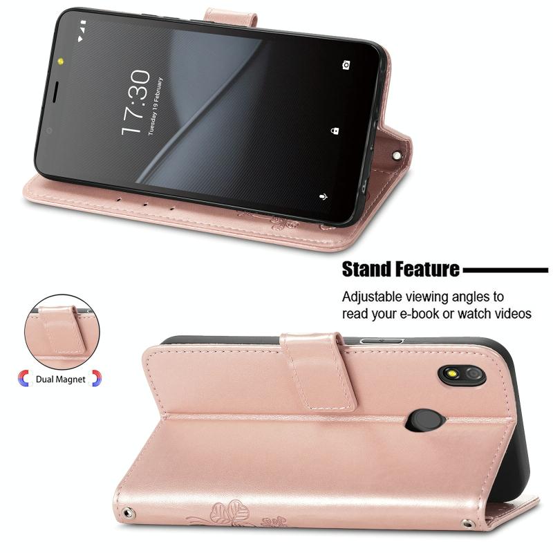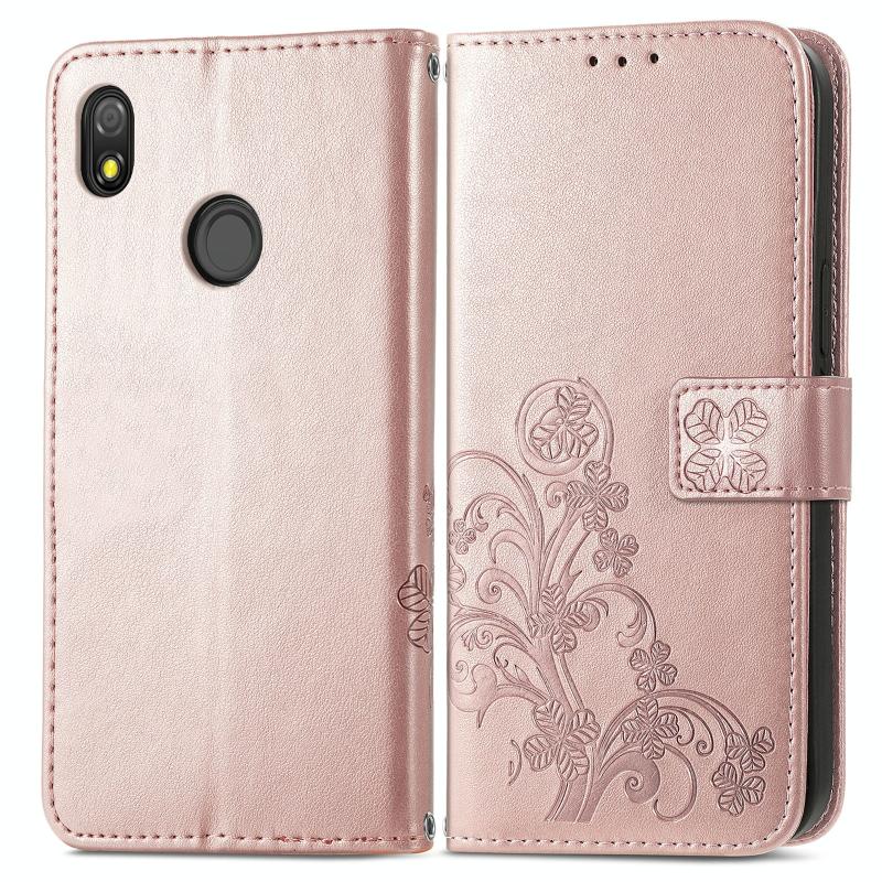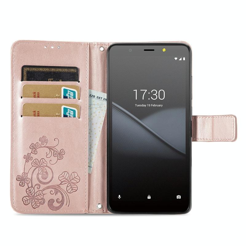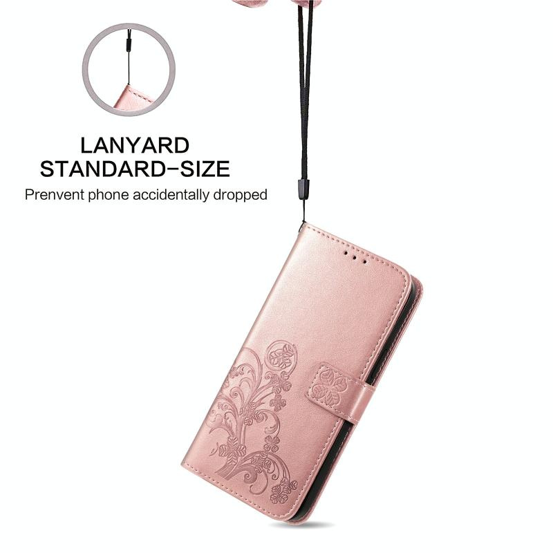 For Tecno Pop 3 Four-leaf Clasp Embossed Buckle Mobile Phone Protection Leather Case with Lanyard & Card Slot & Wallet & Bracket Function(Rose Gold)