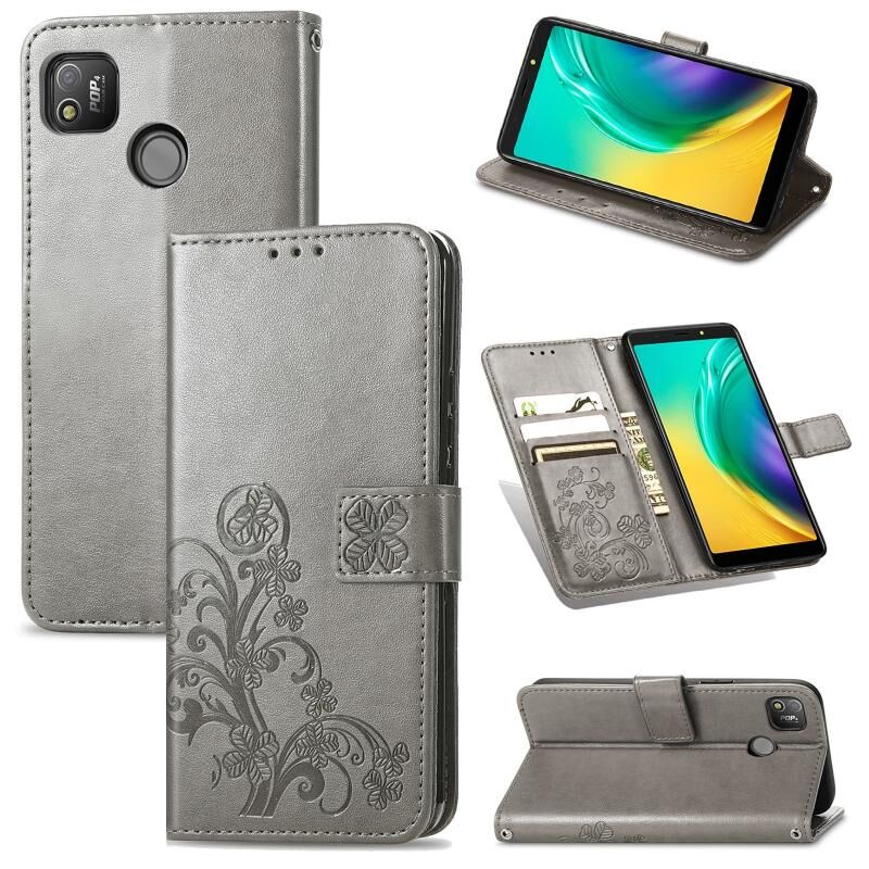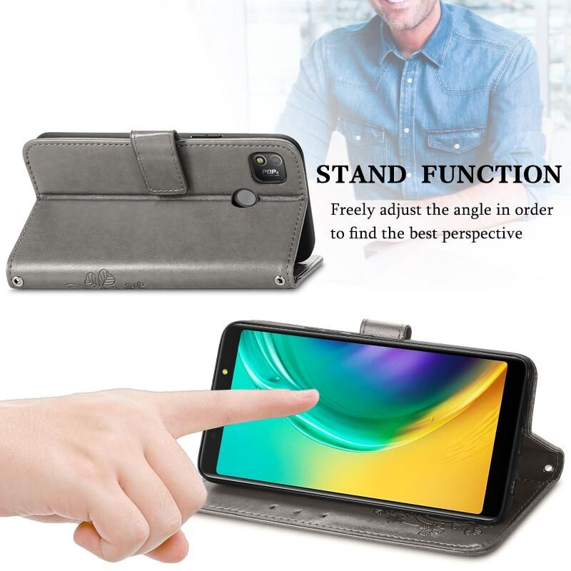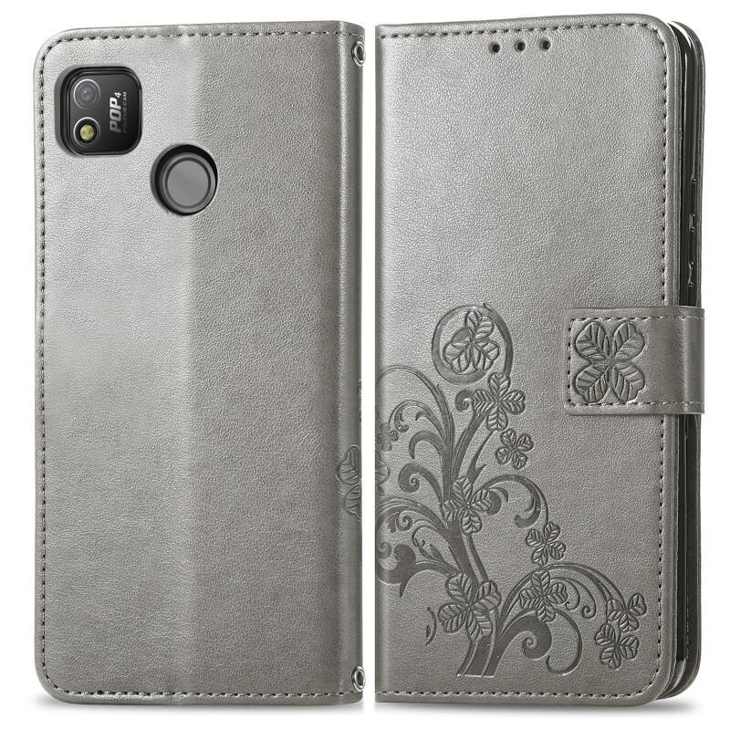 Θήκη κινητού τηλεφώνου από δέρμα με λουράκι, θήκη με καρτέλες, πορτοφόλι και λειτουργία βάσης για Tecno POP 4 με κουμπωτό κλείσιμο σε σχήμα τετράφυλλου τριφυλλιού (Χρυσό ροζ)