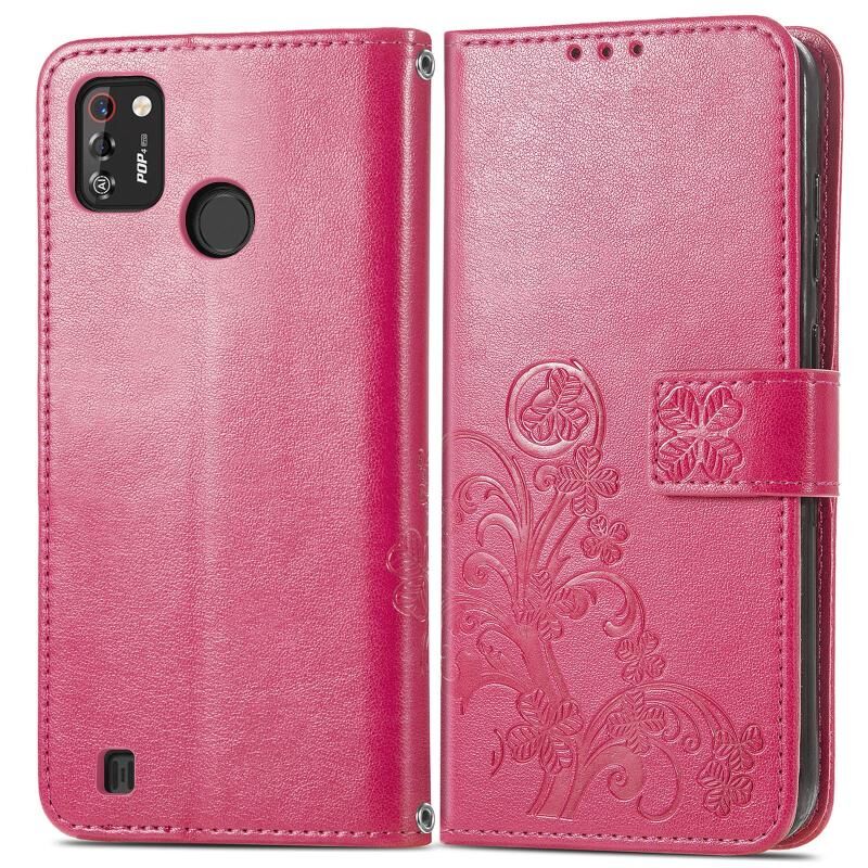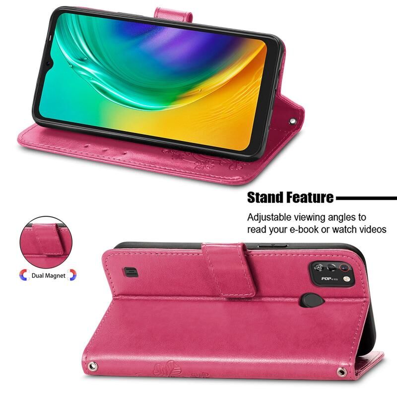 Θήκη δερμάτινη προστασίας κινητού τηλεφώνου για Tecno POP 4 Pro με κουμπωτό κούμπωμα σε σχήμα τριφυλλιού, ανάγλυφο, με κορδόνι, θήκη για κάρτες, πορτοφόλι και λειτουργία βάσης (Ματζέντα)