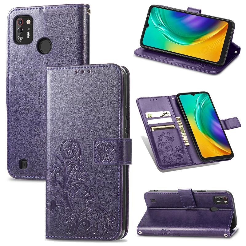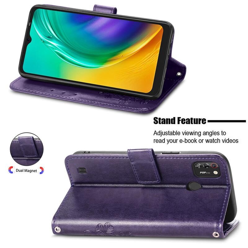 Θήκη δερμάτινη προστασίας κινητού τηλεφώνου για Tecno POP 4 Pro με κουμπωτό κούμπωμα σε σχήμα τριφυλλιού, ανάγλυφο, με κορδόνι, θήκη για κάρτες, πορτοφόλι και λειτουργία βάσης (Χρυσό Ρόδι)