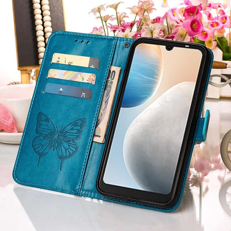 Θήκη τηλεφώνου Tecno POP 6 με ανάγλυφο σχέδιο πεταλούδας, δερμάτινη, τύπου flip (Μπλε)