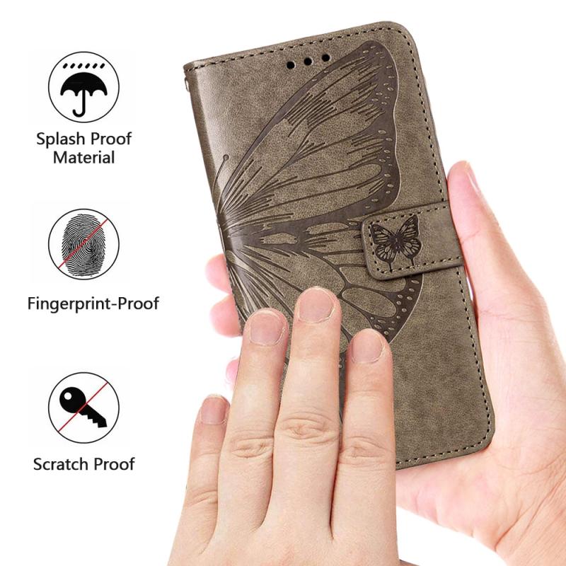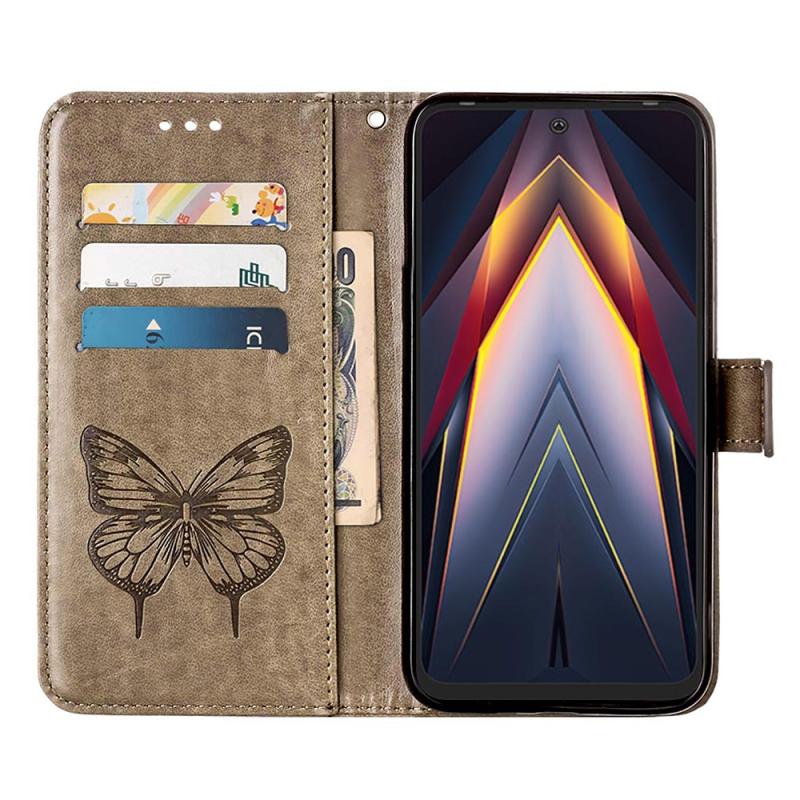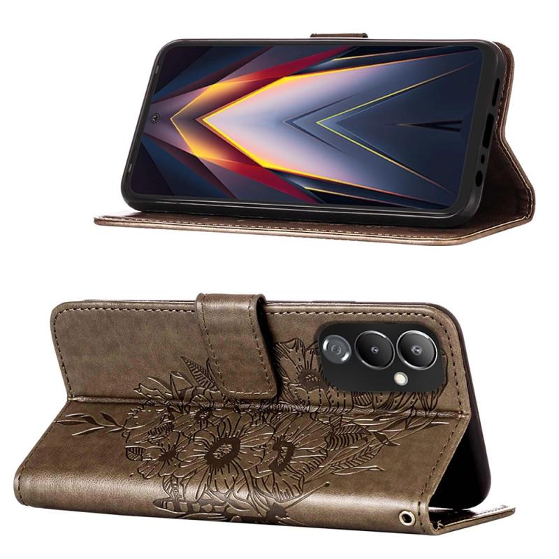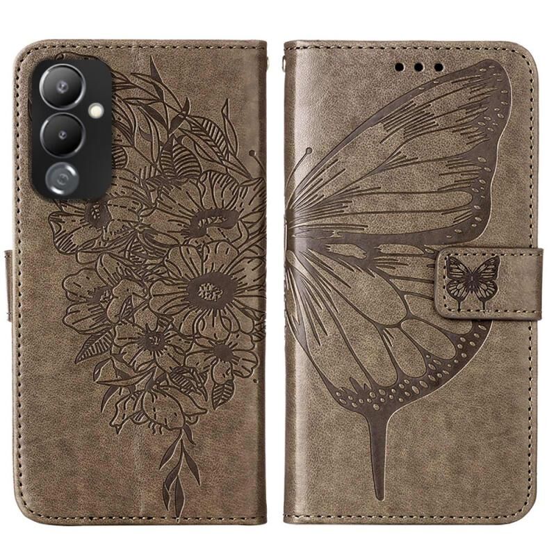 Θήκη τηλεφώνου Tecno Pova 4 LG7N από δέρμα με ανάγλυφο σχέδιο πεταλούδας και φλις (Γκρι)