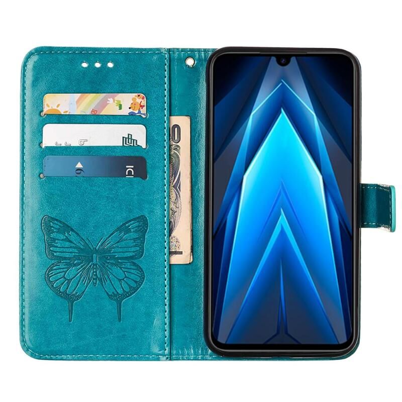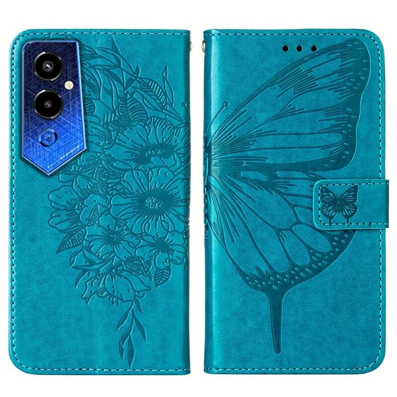 Θήκη τηλεφώνου Tecno Pova 4 Pro LG8N με ανάγλυφο σχέδιο πεταλούδας, δερμάτινη, τύπου flip (Μπλε)