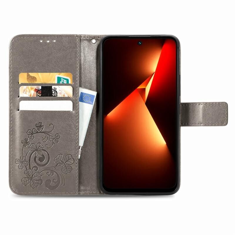 Για Tecno Pova 5 4G τετράφυλλο κούμπωμα ανάγλυφο αγκράφα δερμάτινη θήκη τηλεφώνου (γκρι)
