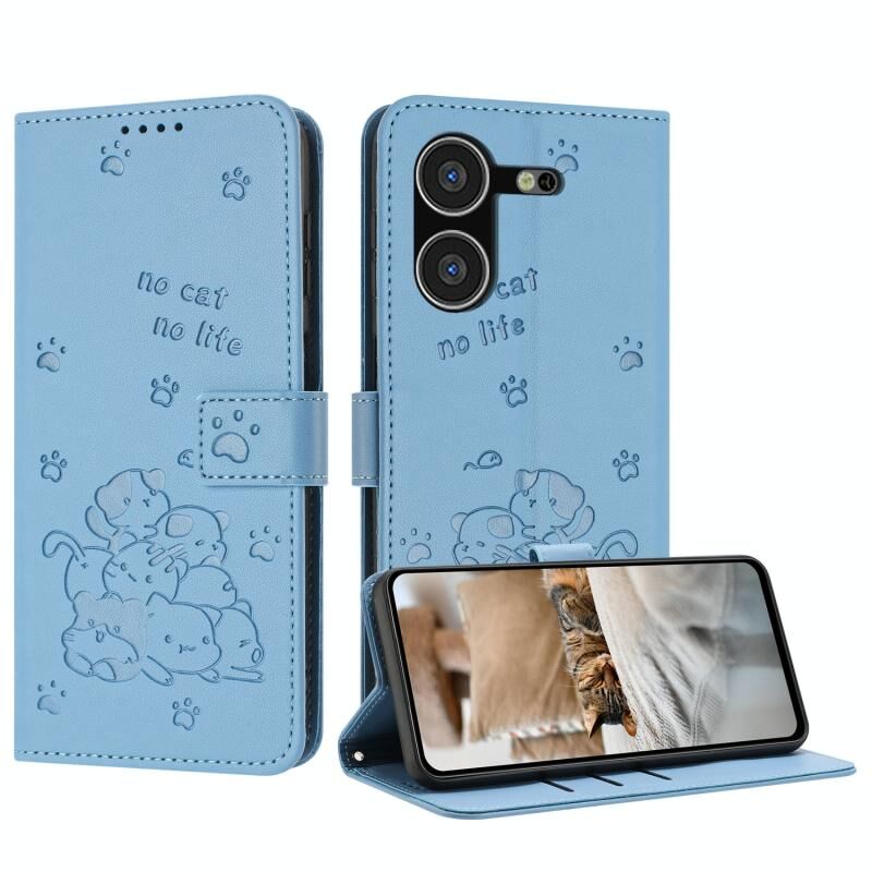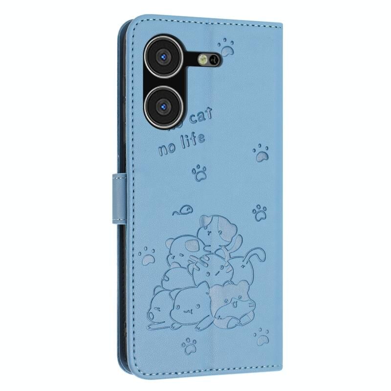 Θήκη δέρματος για Tecno Pova 5 με ανάγλυφο σχέδιο γατάκι και κορδόνι (Μωβ)