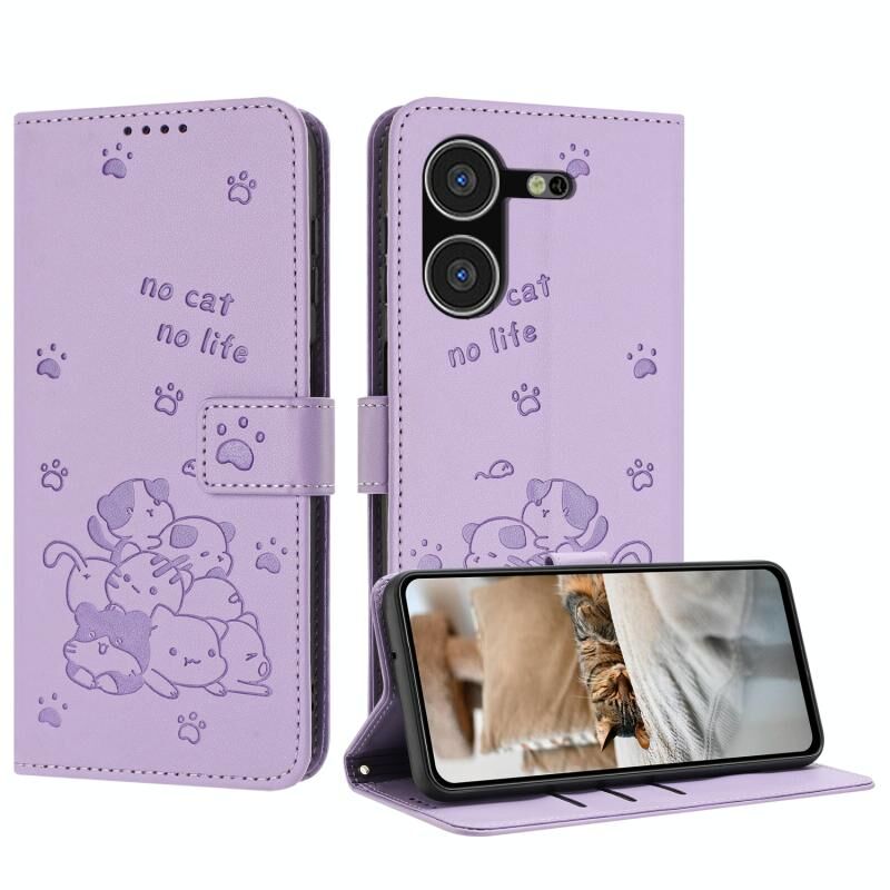 Θήκη δέρματος για Tecno Pova 5 με ανάγλυφο σχέδιο γατάκι και κορδόνι (Μωβ)