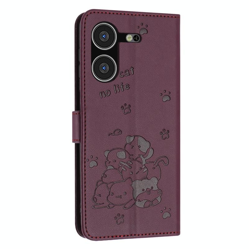 Θήκη δέρματος για Tecno Pova 5 με ανάγλυφο σχέδιο γατάκι και κορδόνι (Μωβ)