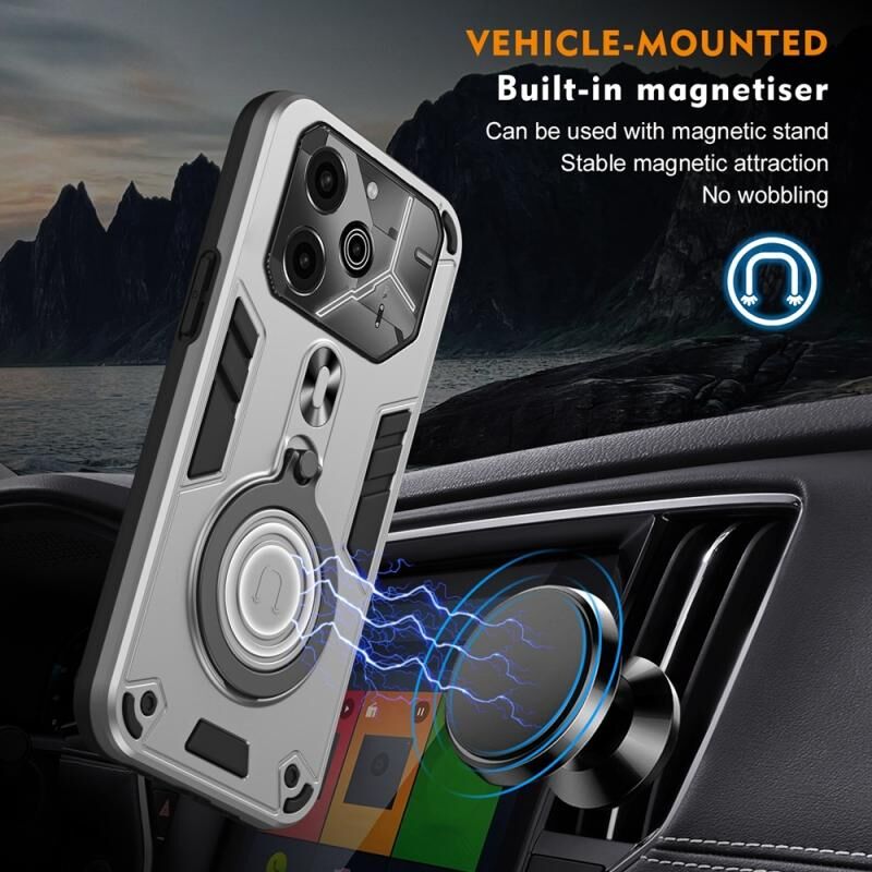 Για Tecno Pova 6 Μεταλλικό δαχτυλίδι 360 μοίρες περιστρεφόμενο κάτοχος PC υβριδικό TPU τηλέφωνο υπόθεση (ασημί γκρι)
