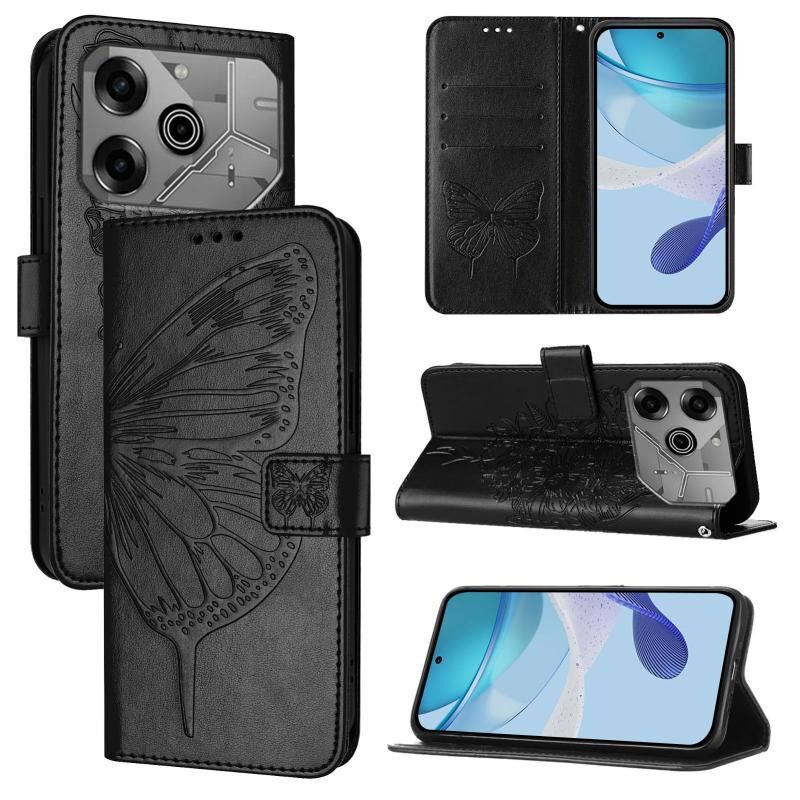 Θήκη τηλεφώνου Tecno Pova 6 Neo με ανάγλυφο σχέδιο πεταλούδας από δέρμα (Μαύρο)