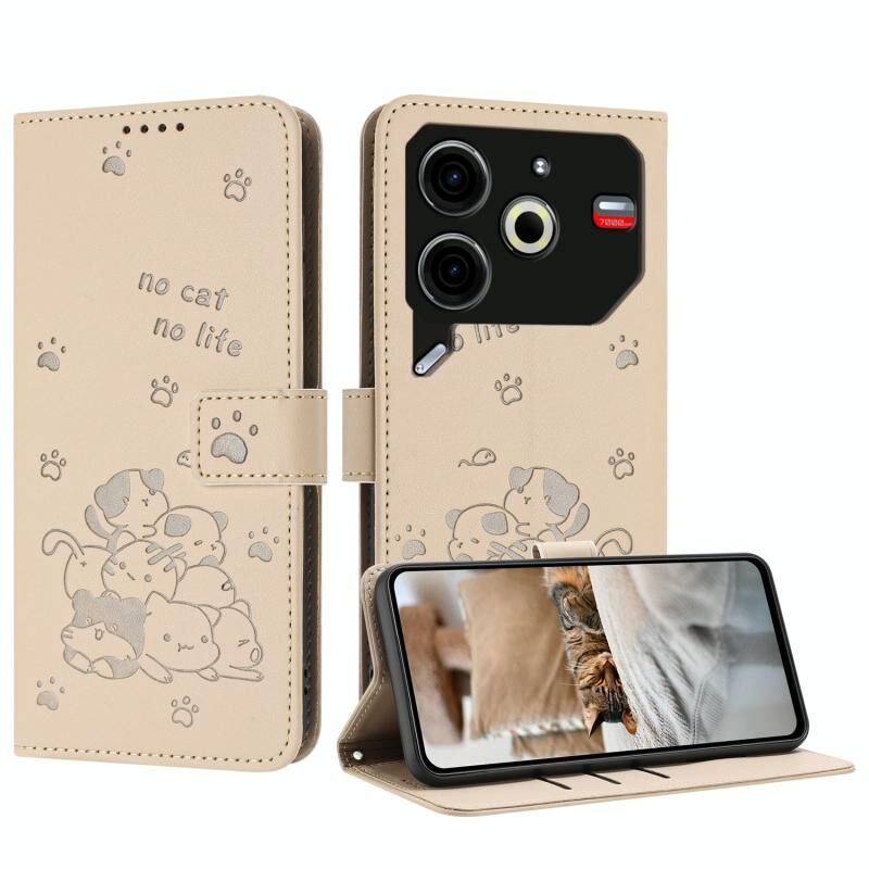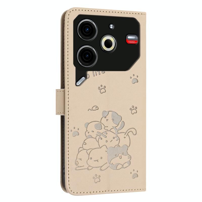 Θήκη δερμάτινη για Tecno Pova 6 Neo με ανάγλυφο σχέδιο γατάκι και κορδόνι (Μπεζ)