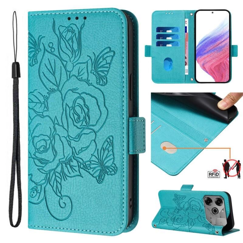 For Tecno Pova 6 Neo Embossed Rose RFID Anti-theft Leather Phone Case(Light Blue)