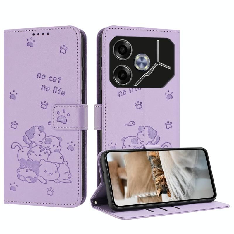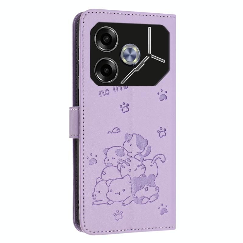 Θήκη δέρματος τηλεφώνου με ανάγλυφο γατάκι και λουρί για Tecno Pova 6 Pro / Pova 6 5G (Μωβ)