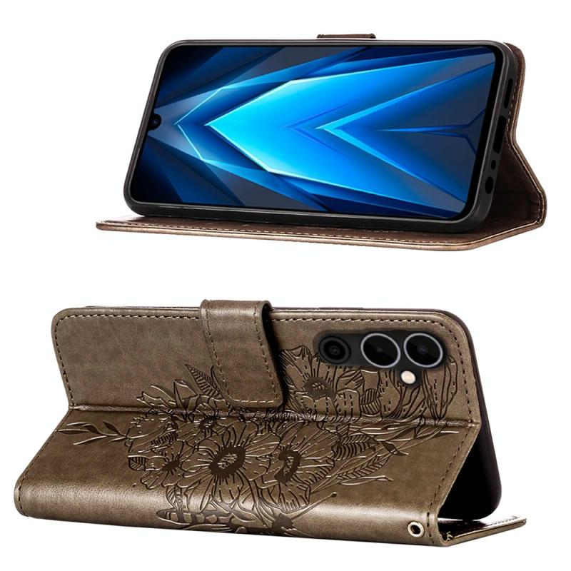 Θήκη τηλεφώνου Tecno Pova Neo 2 LG6N από δέρμα με ανάγλυφο σχέδιο πεταλούδας και φλις (Γκρι)
