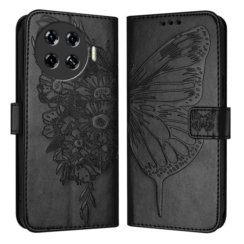 Θήκη τηλεφώνου από δέρμα με ανάγλυφο σχέδιο πεταλούδας για Tecno Spark 20 Pro+ (Μαύρο)