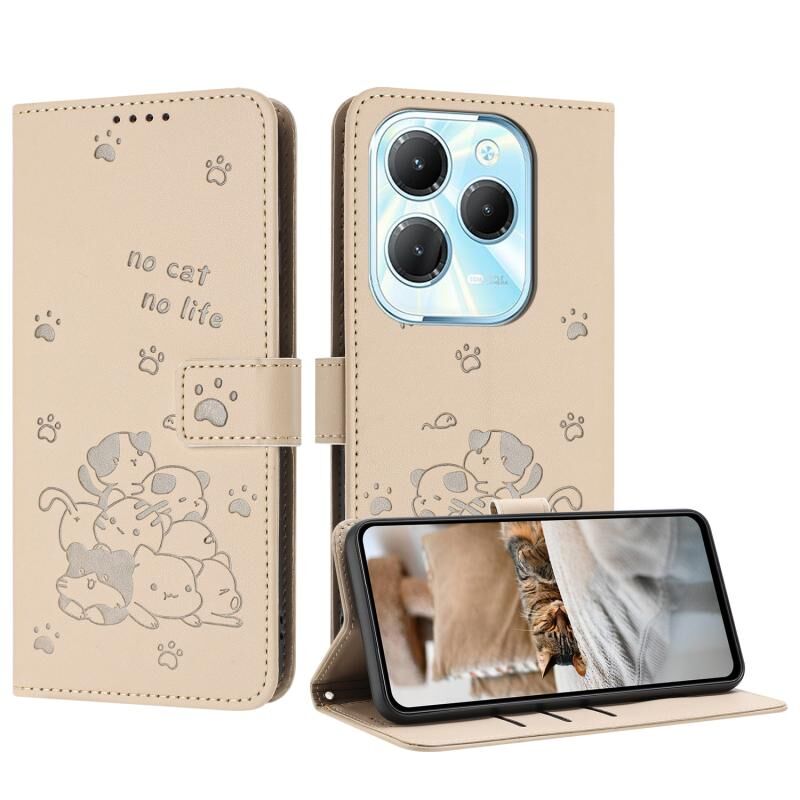 Θήκη δερμάτινη για Tecno Spark 20 Pro με ανάγλυφο σχέδιο γατάκι και κορδόνι (Μπεζ)