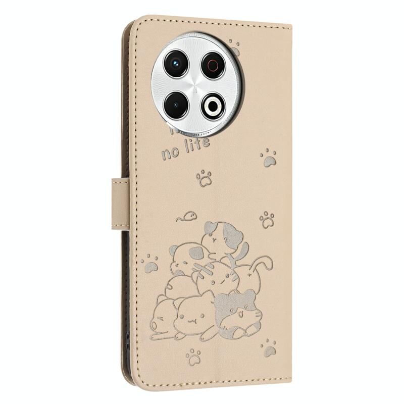 Θήκη δερμάτινη για Tecno Spark 30 Pro με ανάγλυφο σχέδιο γατάκι και λουρί (Μπεζ)