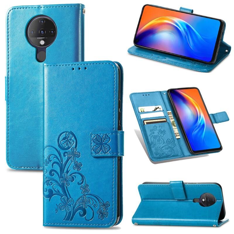 Για Tecno Spark 6 τετράφυλλο κούμπωμα ανάγλυφη αγκράφα Κινητό τηλέφωνο προστασία δερμάτινη θήκη με κορδόνι & υποδοχή κάρτας & πορτοφόλι & λειτουργία βραχίονα (μπλε)