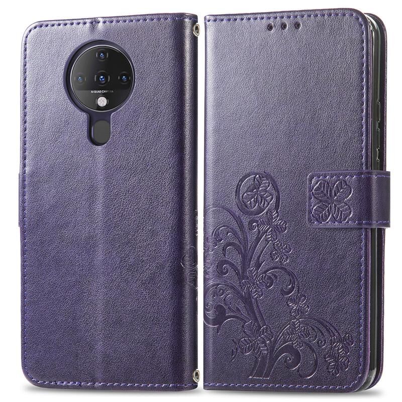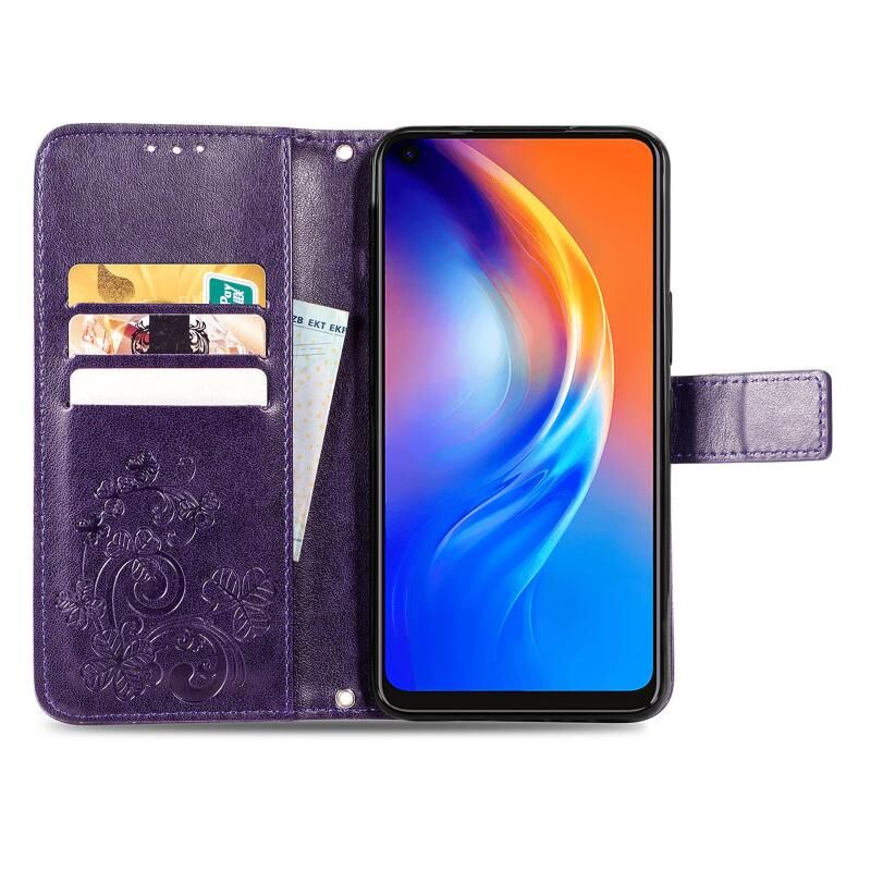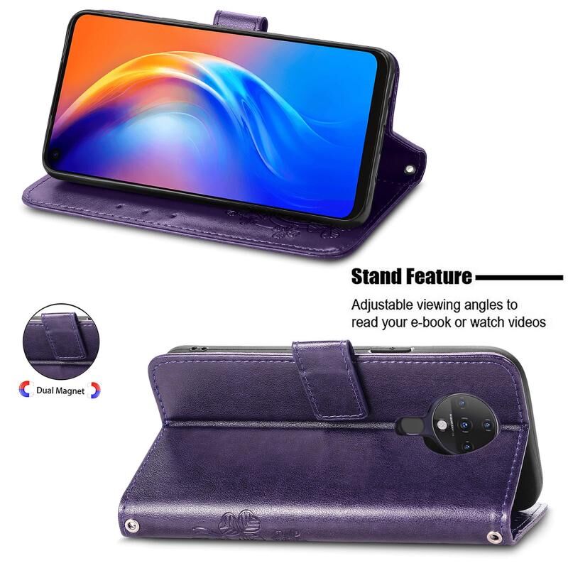 Για Tecno Spark 6 Τέσσερα φύλλα κούμπωμα ανάγλυφο αγκράφα κινητό τηλέφωνο προστασία δερμάτινη θήκη με κορδόνι & υποδοχή κάρτας & πορτοφόλι & λειτουργία βραχίονα (μωβ)