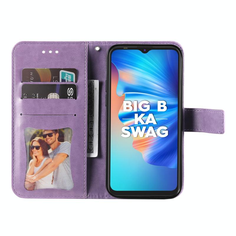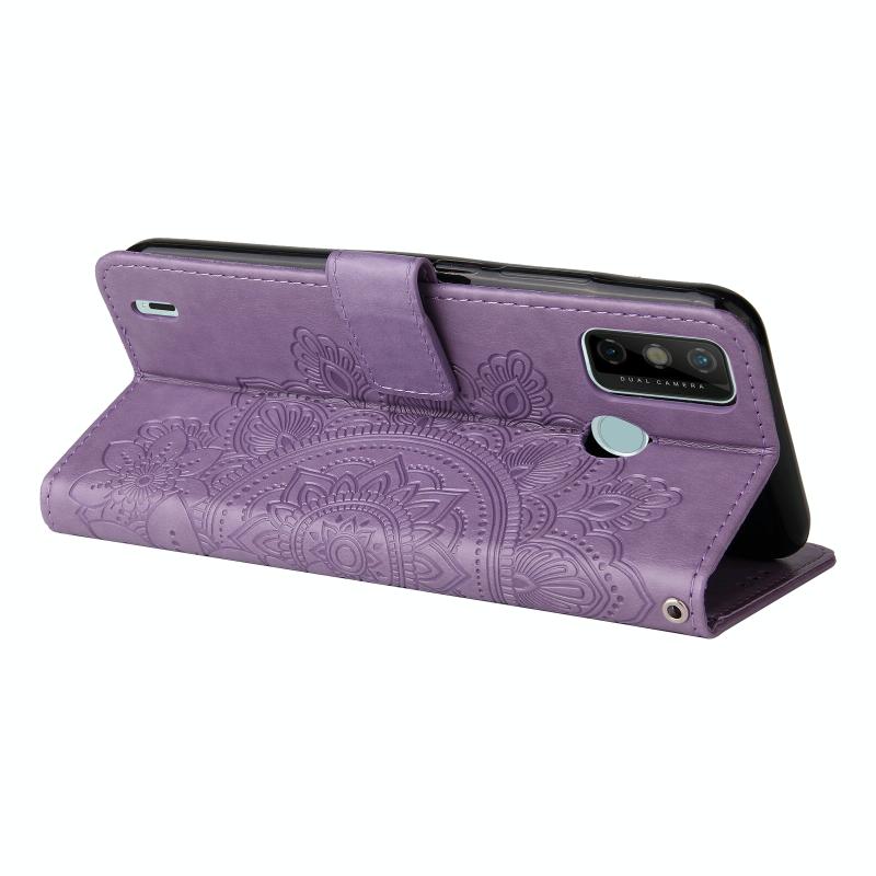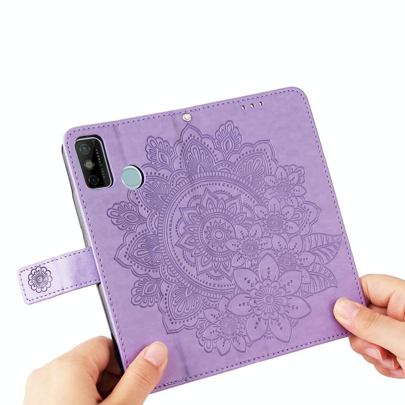 Θήκη Tecno Spark 6 Go με 7 πέταλα λουλουδιών, ανάγλυφο σχέδιο, οριζόντια, από δερματίνη PU με βάση στήριξης, θήκες για κάρτες, πορτοφόλι & κορνίζα φωτογραφίας (ανοιχτό μωβ)