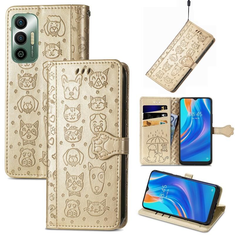 Θήκη τηλεφώνου Tecno Spark 7 με ανάγλυφο σχέδιο γάτας και σκύλου από δέρμα (Μπλε)