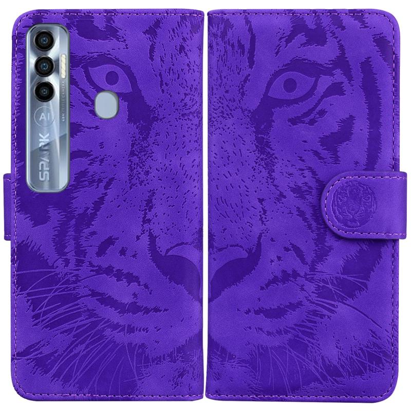 Θήκη τηλεφώνου από δέρμα με οριζόντιο άνοιγμα για Tecno Spark 7 Pro με ανάγλυφο σχέδιο τίγρης (Μωβ)