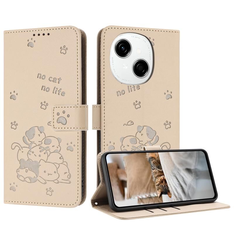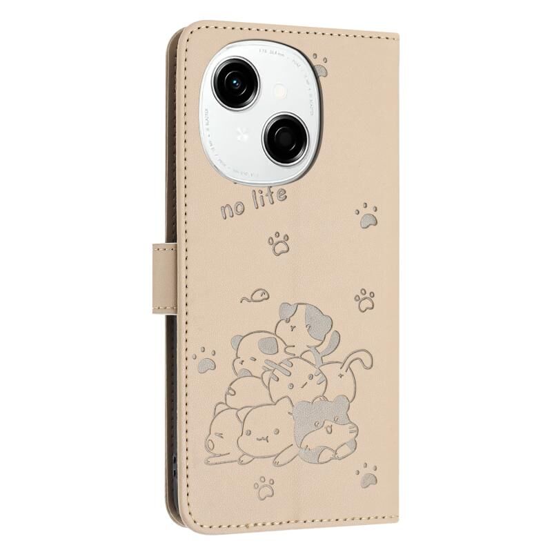 Θήκη δερμάτινη για Tecno Spark Go 1 / Go 2025 με ανάγλυφο σχέδιο γατάκι και κορδόνι (Μπεζ)