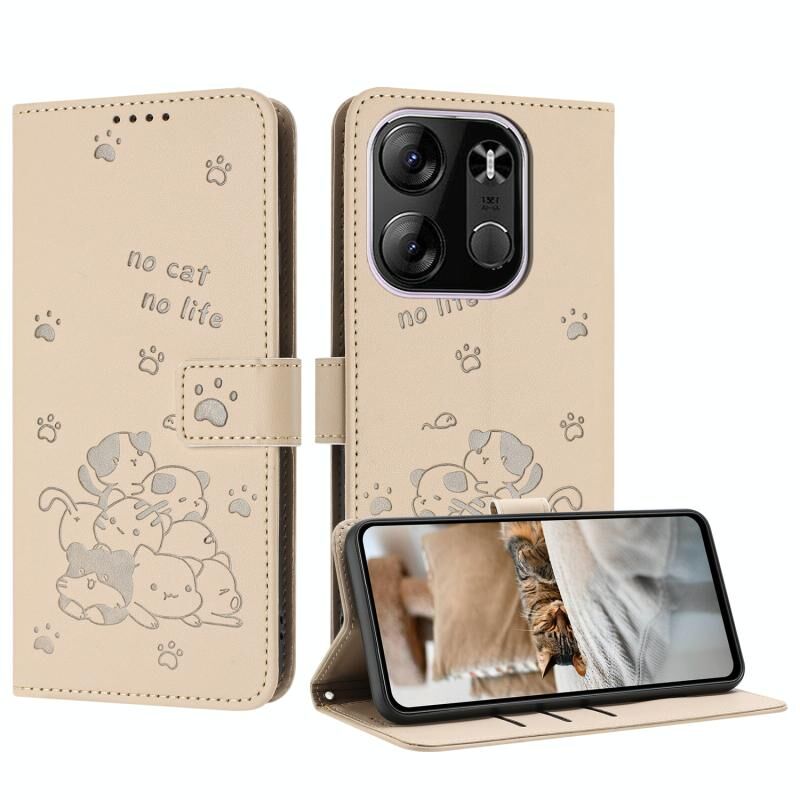 Θήκη δερμάτινη για Tecno Spark Go 2023 με ανάγλυφο σχέδιο γατάκι και κορδόνι (Μπεζ)
