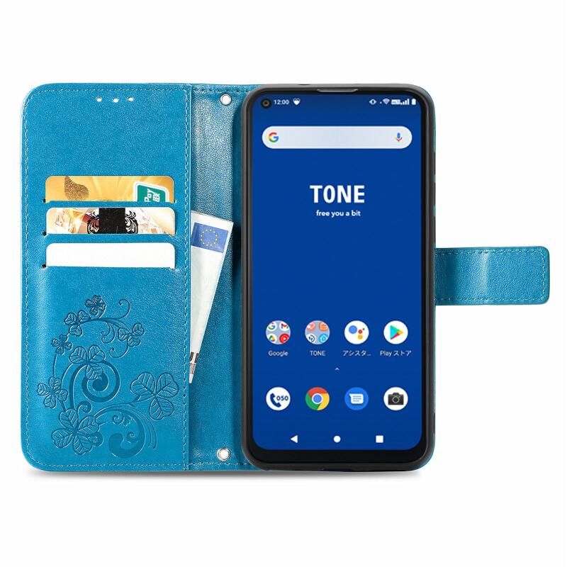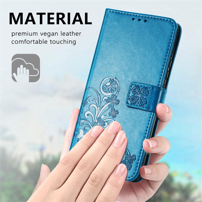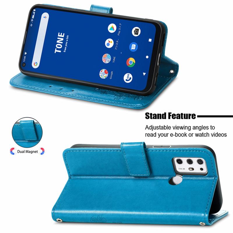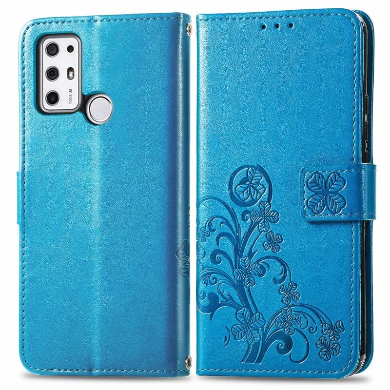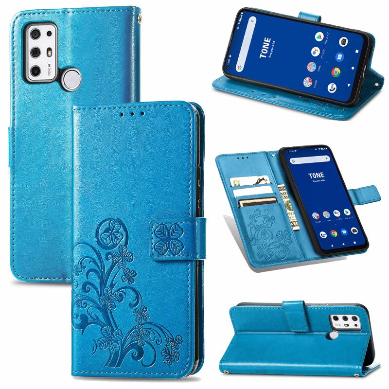 For Tone E21 Four-leaf Clasp Embossed Buckle Mobile Phone Protection Leather Case with Lanyard & Card Slot & Wallet & Bracket Function(Blue)