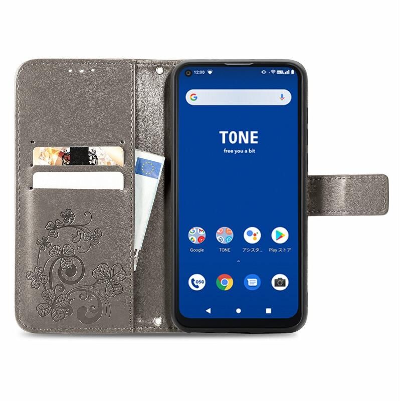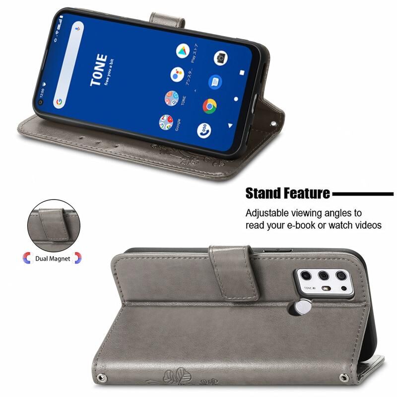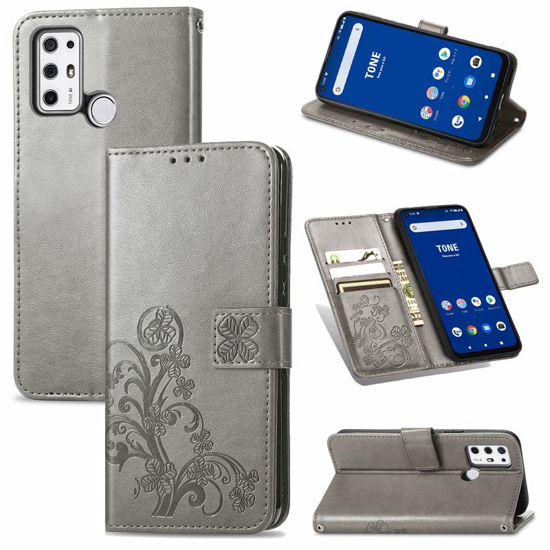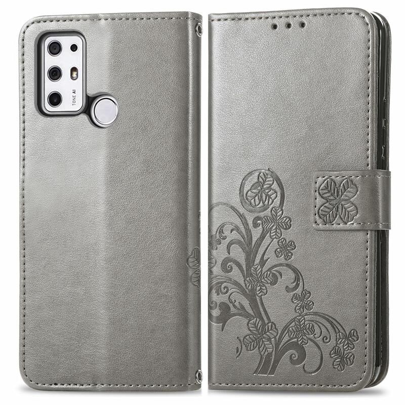 For Tone E21 Four-leaf Clasp Embossed Buckle Mobile Phone Protection Leather Case with Lanyard & Card Slot & Wallet & Bracket Function(Gray)