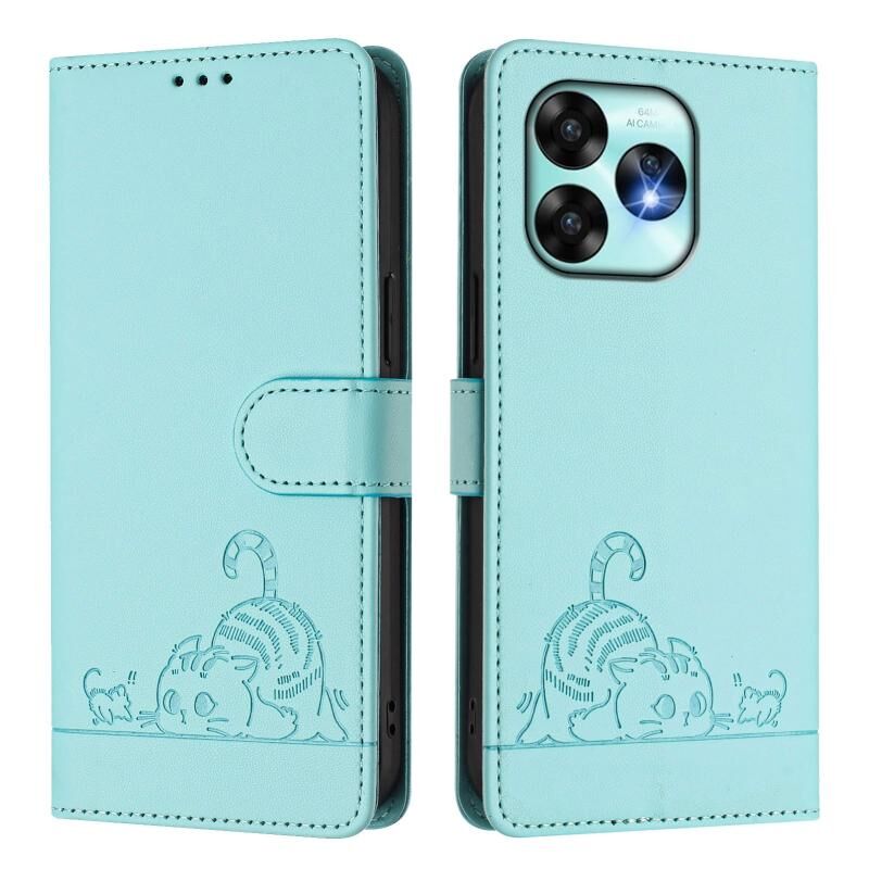 Θήκη τηλεφώνου από δέρμα με ανάγλυφο σχέδιο γάτας και ποντικού για UMIDIGI A15 / A15C / A15T με κορδόνι (Μέντας Πράσινο)