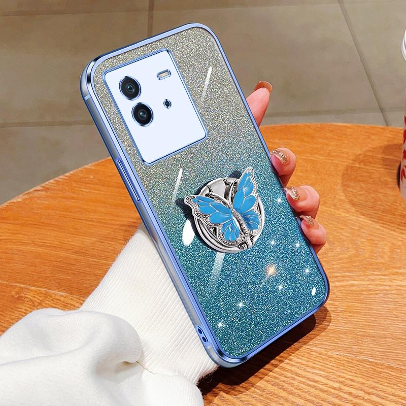 For vivo iQOO Neo6 Plated Gradient Glitter Butterfly Holder TPU Phone Case(Sierra Blue)