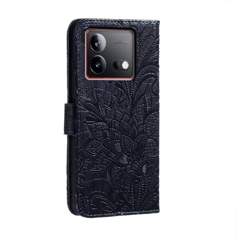 Για vivo iQOO Neo8 Lace λουλούδι ανάγλυφο Flip υπόθεση τηλεφώνου δέρμα (Σκούρο μπλε)