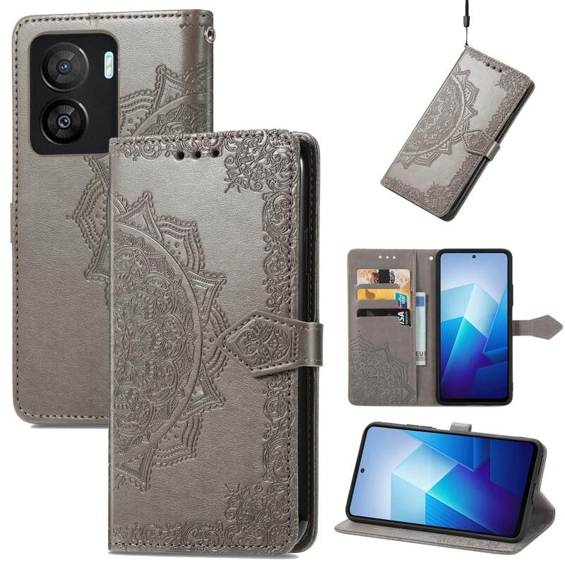 Για vivo iQOO Z7 Mandala λουλούδι ανάγλυφο δερμάτινη θήκη τηλεφώνου (γκρι)
